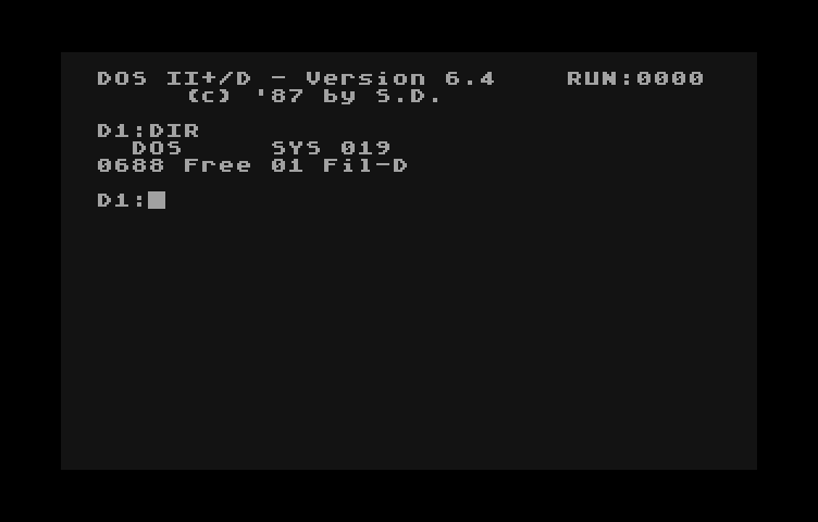 Teraz możemy wgrać wcześniej skopiowany na kartę obraz. Jeśli Atari jest włączone i zgłosił się Atari BASIC, to wystarczy wpisać BYE i po ukazaniu się SELF TESTu trzymając klawisz OPTION nacisnąć RESET. Można również trzymając klawisz OPTION wyłączyć i po kilku sekundach włączyć komputer. Po chwili załaduje się DOS.