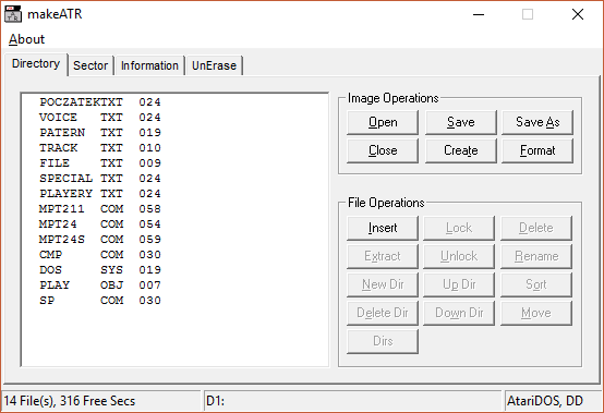 Następnie wystarczy dodawać do stworzonego obrazu kolejne pliki za pomocą przycisku INSERT — przy czym należy pamiętać, że identyfikatory plików muszą być w formacie 8 znaków nazwy i 3 znaki rozszerzenia. Po dodaniu pliku pojawia się on na liście po lewej stronie okna programu wraz z liczbą zajmowanych sektorów. Sformatowana dyskietka w podwójnej gęstości składa się z 707 sektorów, liczbę wolnych sektorów można w każdej chwili sprawdzić w linii statusu znajdującej się na samym dole okna programu.