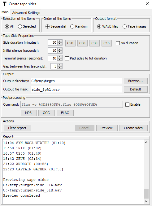 Pojawi się okno, w którym będziemy generować docelowe obrazy, które będą gotowe do nagrania. W pierwszej kolejności zaznaczamy opcje: All (chcemy stworzyć składankę z wszystkich plików), Sequential (w kolejności wcześniej podanej – o tym więcej później), WAVE files (potrzebujemy nieskompresowanych plików audio). Następnie mamy do wyboru długość taśmy – załóżmy, że korzystamy z typowej kasety C60 – naciskamy przycisk C60. Teraz wybieramy docelowy katalog, gdzie będą zapisane pliki WAV (Output directory). Pozostałe opcje nas nie interesują. Następnie naciskamy przycisk Preview, który wygeneruje nam podgląd planu pracy konwertera w dolnej części okna (Report).