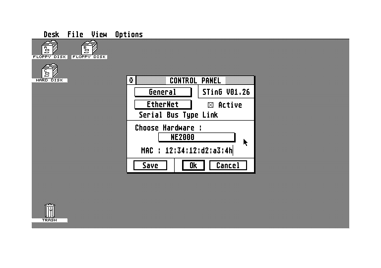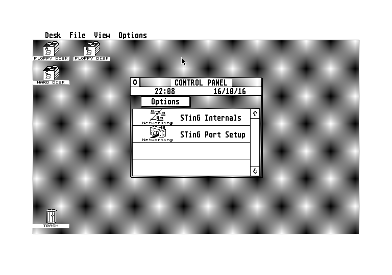 W tym celu rozpakowujemy do głównego katalogu twardego dysku Atari zawartość archiwum STinG126.zip (jeśli w Waszym systemie nie ma zainstalowanego programu rozpakowującego możecie zrobić to na PC i przenieść zawartość na dyskietce 720 KB), w którym oprócz plików ze stosem znajduje się aplikacja zarządzająca akcesoriami. Następnie resetujemy komputer, po czym sprawdzamy czy poprawnie załadował się STinG oraz – przede wszystkim – panel sterowania akcesoriami, znajdziemy go w menu DESK -> Control Panel. Jeśli wszystko wykonaliśmy poprawnie, w panelu sterowania znajdziemy dwie opcje: STinG Internals i STinG Port Setup. Pierwsza z nich to panel informacyjny, którym nie będziemy się zajmować – najważniejszą jest ta druga, czyli konfiguracja stosu. Uruchommy ją.