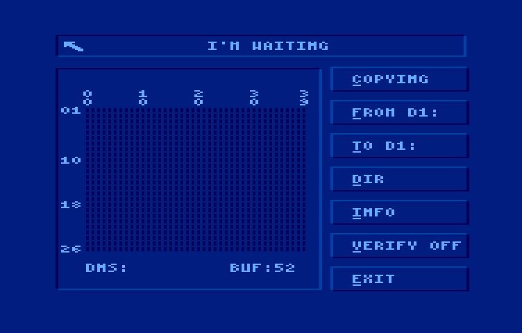 Pierwsza opcja po prawej (COPYING) rozpoczyna kopiowanie, wcześniej należy ustawić parametry kopiowania, czyli dyskietkę źródłową (FROM Dx:) oraz docelową (TO Dx:). Program sam zadba o odpowiednie sformatowanie dysku docelowego. Przycisk DIR w przypadku kopiowania dyskietek niezainicjalizowanych DOSem nie przyda się do niczego, natomiast opcja (VERIFY ON/OFF) już jak najbardziej — pozwala na zweryfikowanie poprawności kopiowania. Włączmy ją jeśli chcemy być pewni, że kopiowanie zakończy się sukcesem. INFO wyświetla informacje o autorze i wersji programu, a EXIT pozwala wyjście z programu.